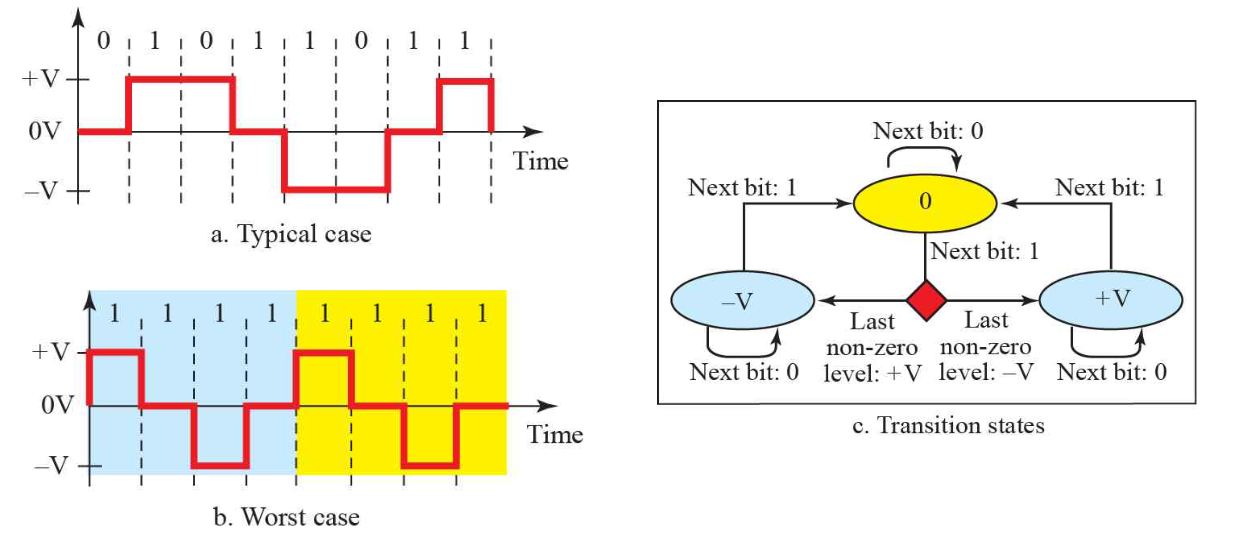 위 두개의 Bipolar 방식은 NRZ와 같은 signal rate을 가지지만, 평균 전압이 0V이므로 직류 성분이 존재하지 않는다.