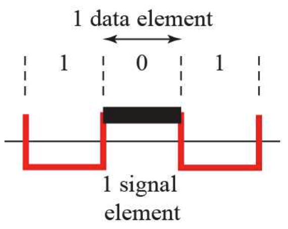 전압이 중간중간 0을 거치지는 않지만 비트와 비트 사이에서 일어나는 변화로 동기화를 수행할 수 있다.