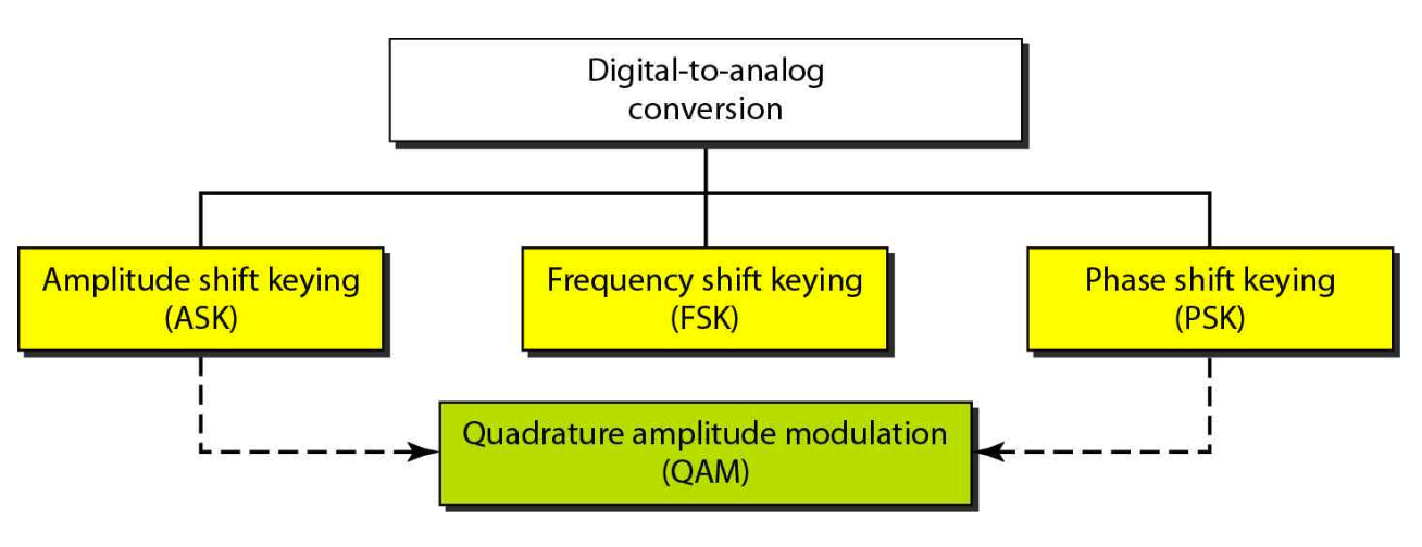 디지털 데이터를 아날로그 신호로 변환하는 방법은 모두 4가지이고, 기반이 되는 방법이 위 사진에서 노란색으로 되어있는 방법들이다.