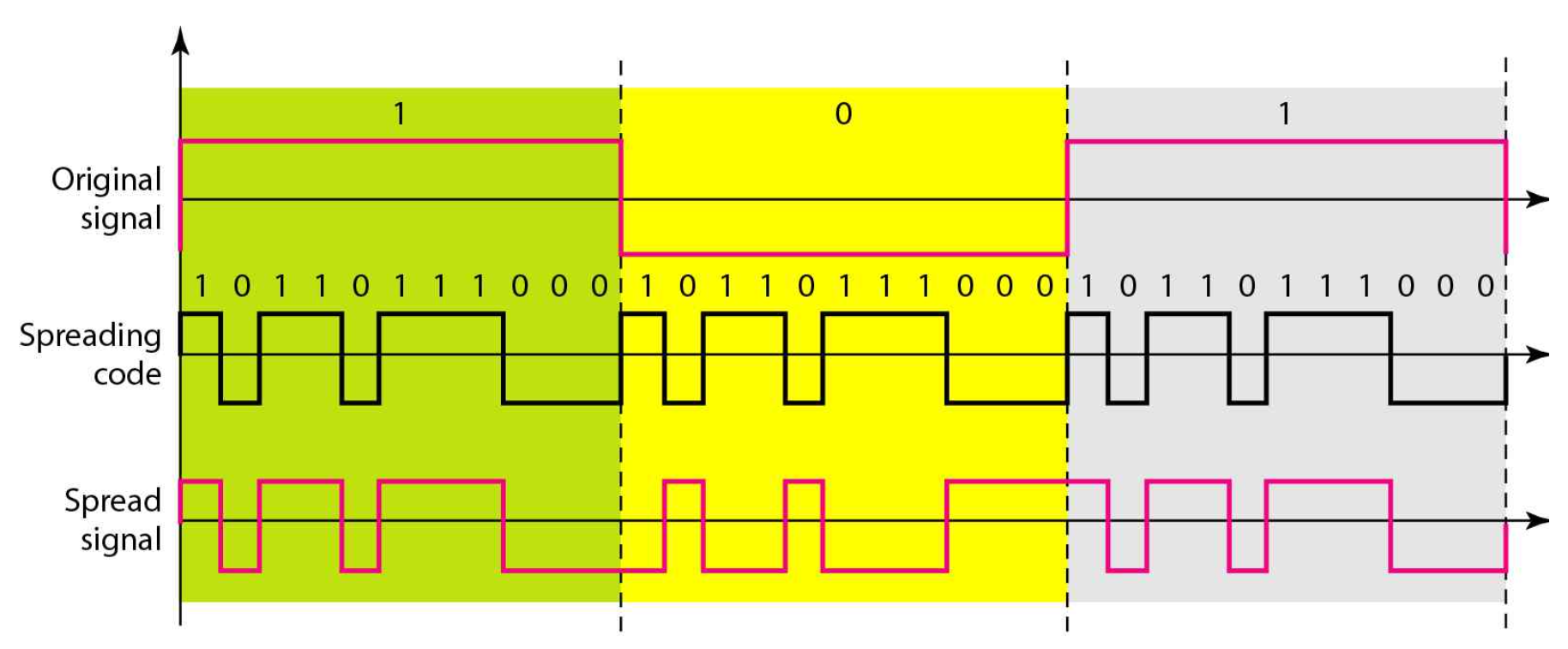 원본 신호와 변조를 위한 신호(Spreading code)를 이용해서 보내는 방식이다.