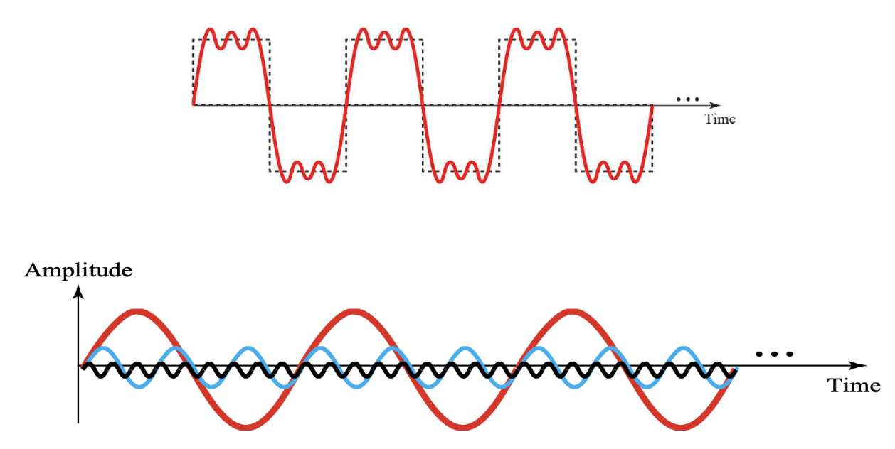 잘 보면, 디지털 신호와 비슷한 파형을 여러 사인파의 합으로 나타냈다는 것을 알 수 있다.