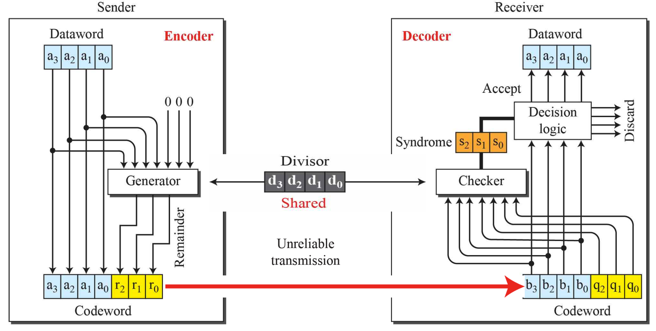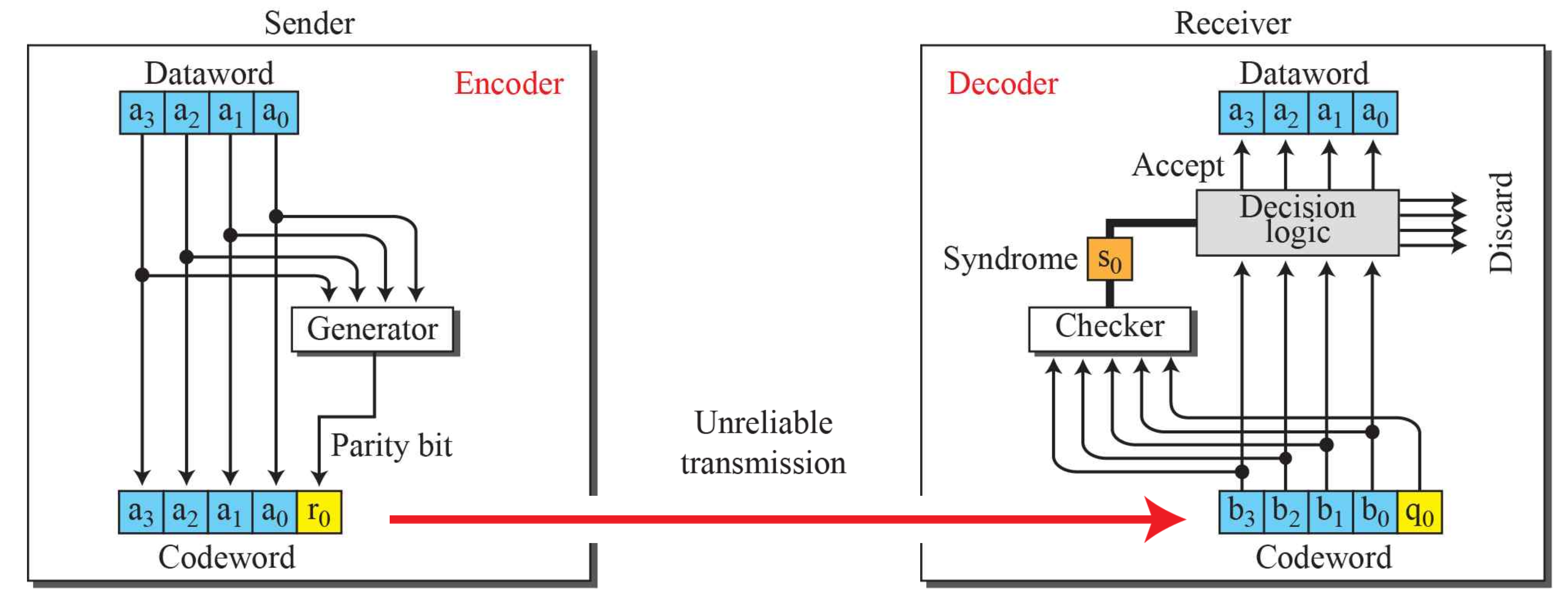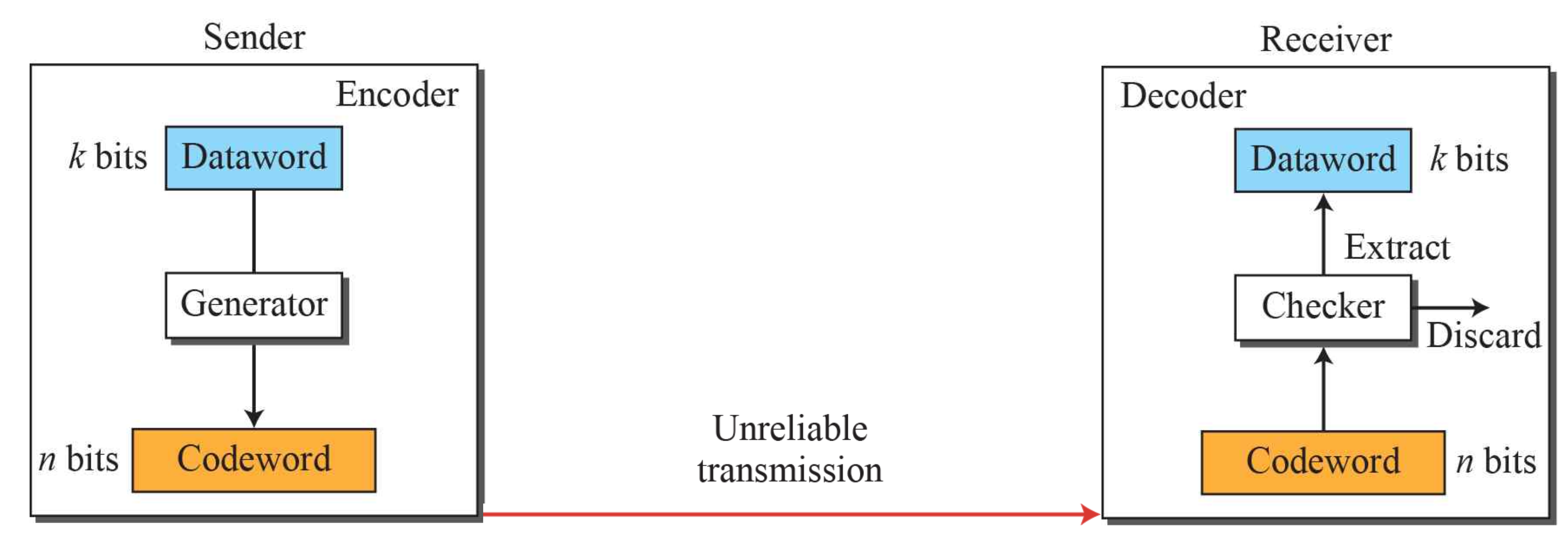 따라서 Checker가 codeword를 확인한 후, 이상하면 버리고(Discard) 맞게 왔다면 dataword만 추출(Extract)한다.
