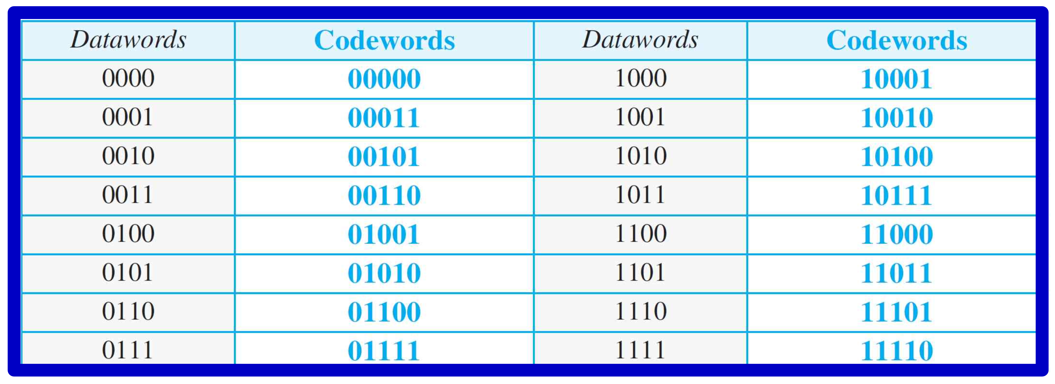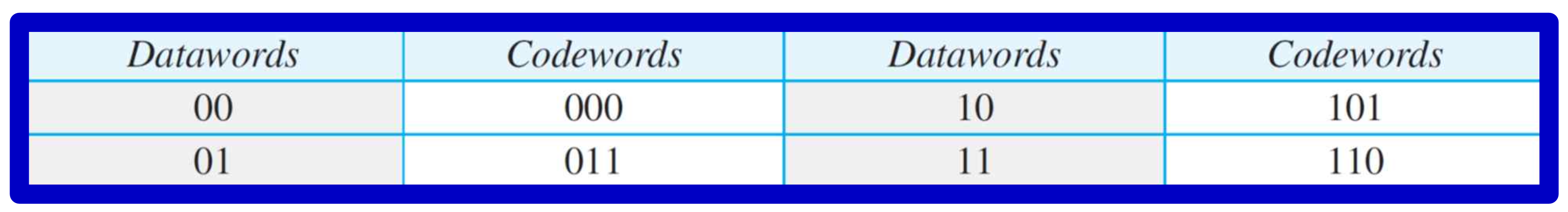 먼저 아래와 같은 dataword와 그에 대응되는 codeword가 적힌 표를 준비하자.