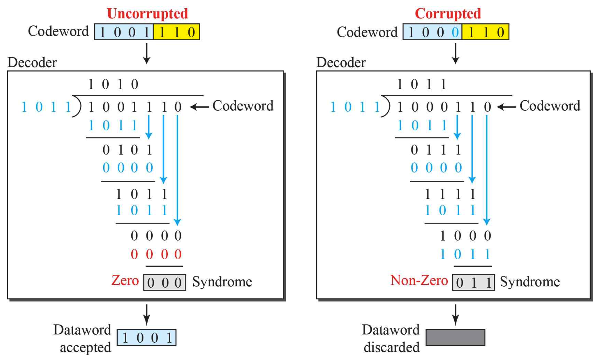 위처럼 dataword의 특정 부분이 corrupted bit가 되면, 나머지가 0이 되지 않아 dataword가 버려짐을 알 수 있다.