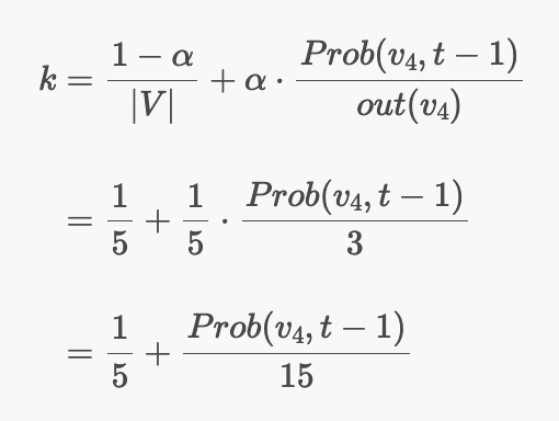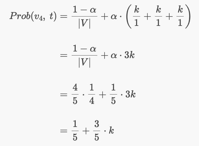 랜덤으로 v4를 방문할 확률은 20% 확률로 링크를 방문하지 않으면서 1/5의 확률로 v4를 랜덤으로 방문하는 경우다.