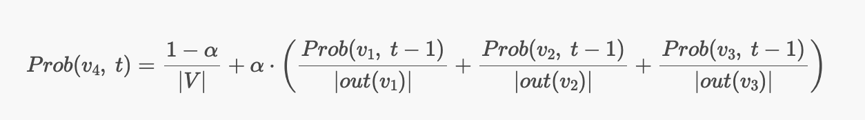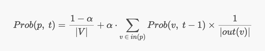 두번째 항은 p를 링크로 걸고있는 page들($v \in in(p)$)이 t-1번째에 방문($Prob(v, \ t-1)$)되면서 링크를 타고($\alpha$) p를 방문($\frac{1}{|out(v)|}$)할 확률이다.