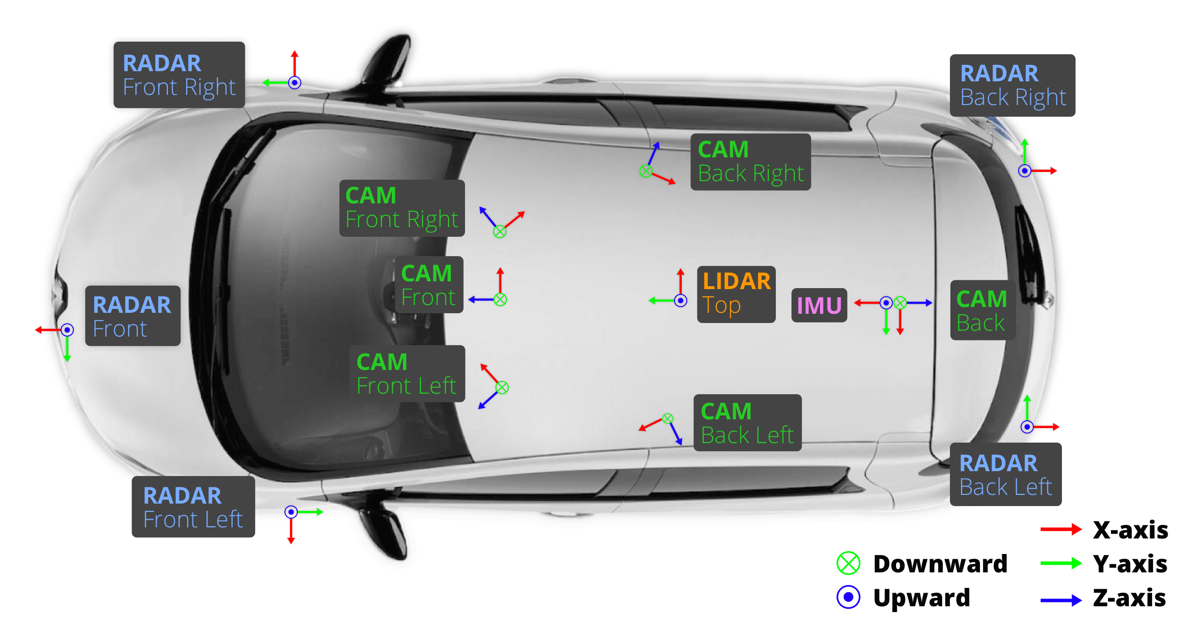 코드 중 방향에 대한 설명을 해보자면, 각 센서마다 좌표계가 다르다는 것이 고려됐다. (위의 자동차 이미지를 같이 보자)