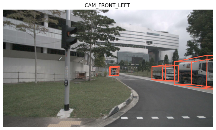 시각화는 첫번째 scene의 앞의 왼쪽 카메라(CAM_FRONT_LEFT)를 기준으로 진행한다.
