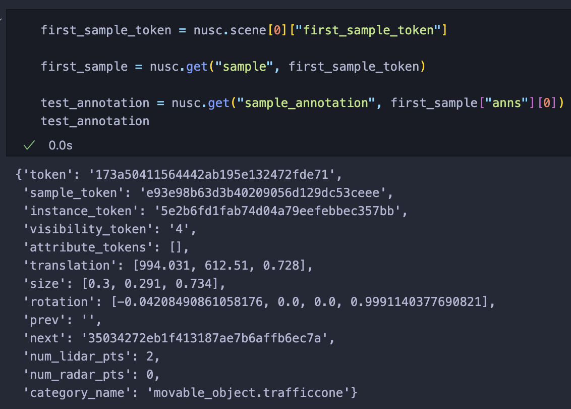 결과적으로 특정 scene의 특정 sample의 annotation들을 찾으려면, scene --> sample --> annotation 순서로 접근해야된다는 것을 알 수 있다.