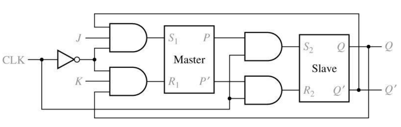 구성을 보면, $Q$의 출력이 K와 AND 게이트로 묶여있고, $\bar {Q}$의 출력이 J의 입력과 묶여있다는 것을 볼 수 있습니다.